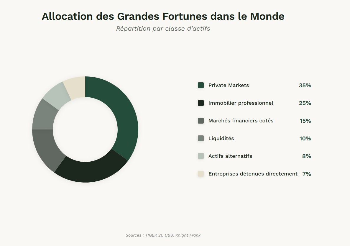 Une autre part — souvent la plus stratégique — repose sur le Private Equity : buy-out, growth, venture, infrastructures… Les grandes fortunes adorent cet actif. Pas parce qu’il sonne bien dans un dîner, mais parce qu’il surperforme historiquement les marchés cotés et qu’il leur permet d’être actionnaires de l’économie réelle.